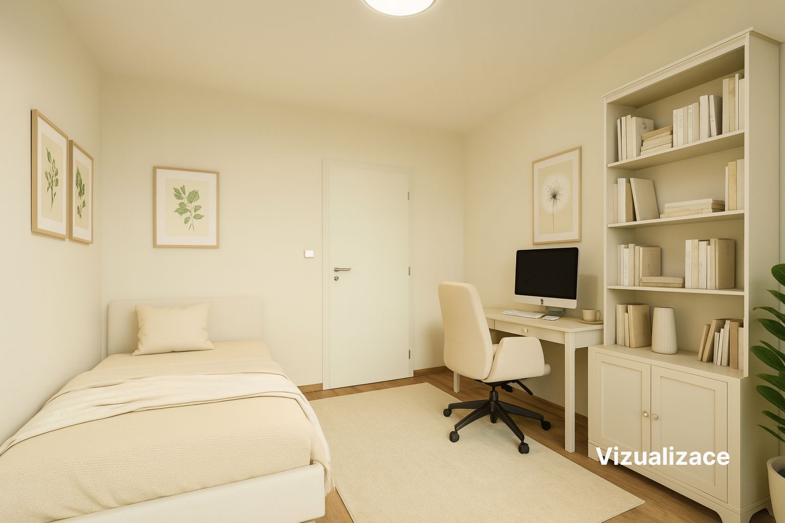 Dva samostatné pokoje (každý 12,3 m²) jsou orientovány na jih, přičemž z jednoho z nich je vstup na balkon (3,5 m²). Předsíň (8,2 m²) nabízí dostatek úložného prostoru. Koupelna má 3,5 m² a WC je samostatné (2,3 m²).