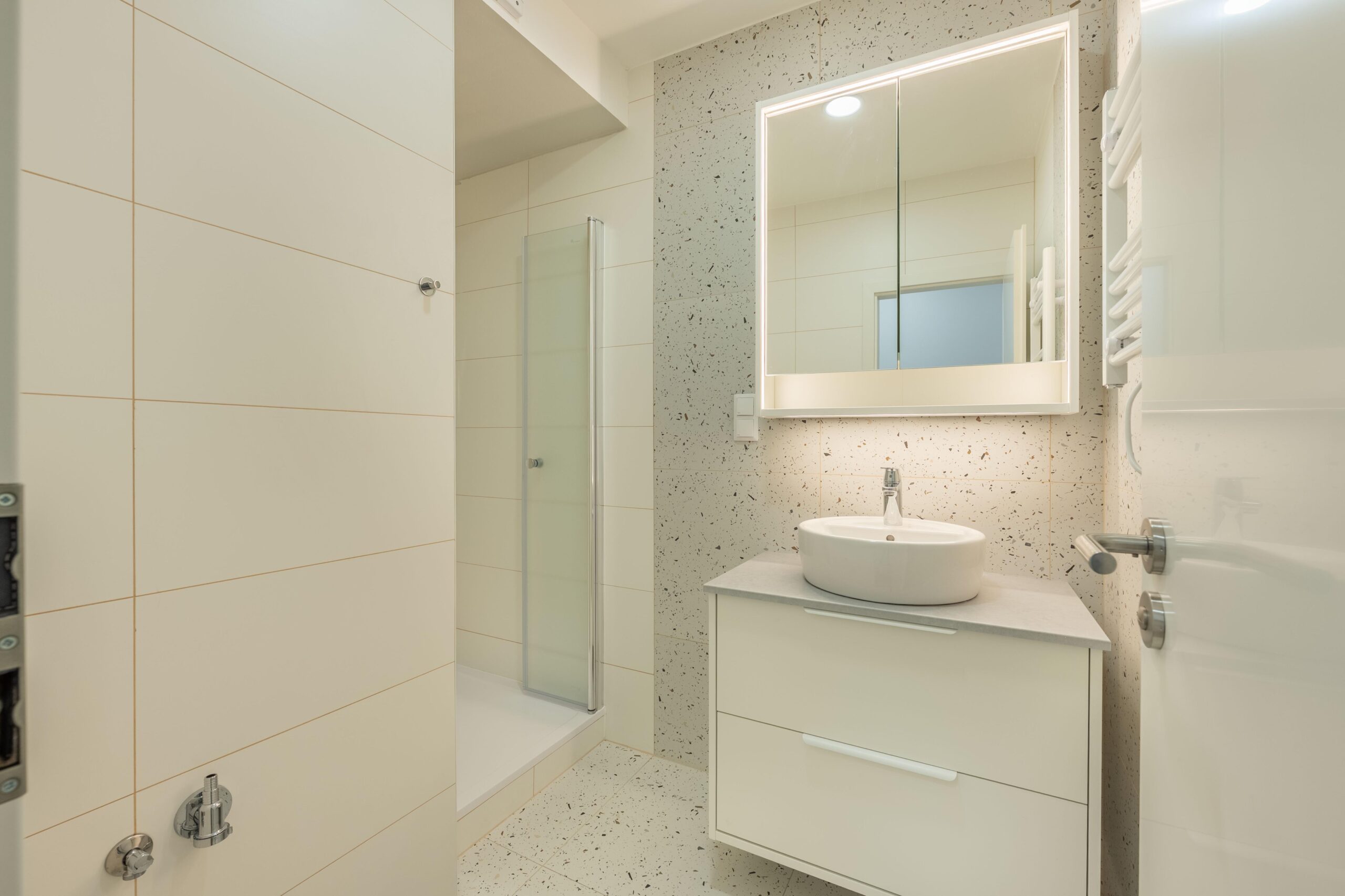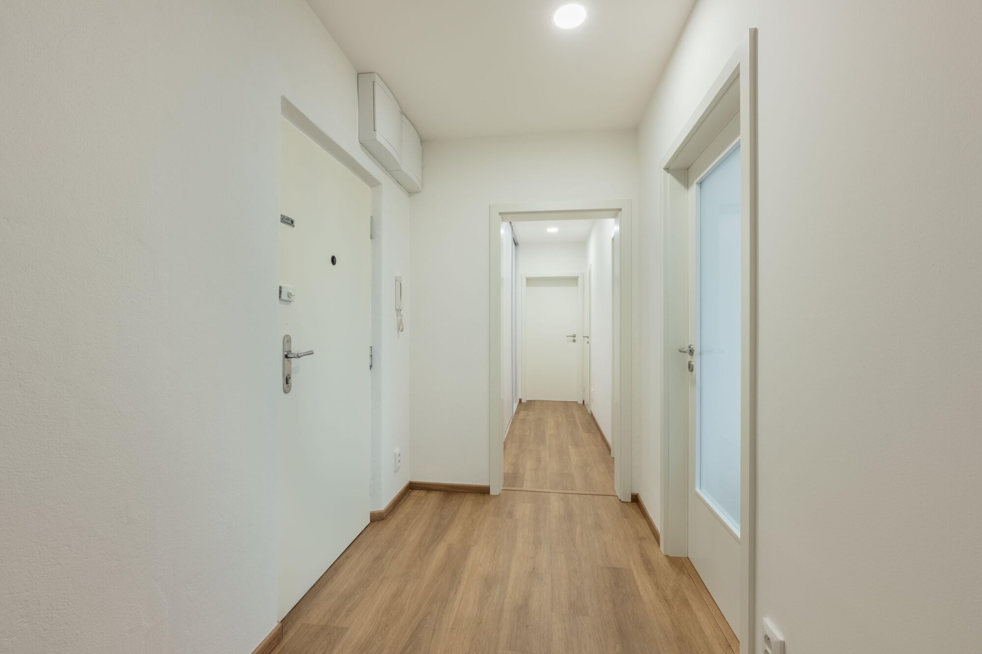 V rámci rekonstrukce se do bytu dodala nová elektroinstalace, kvalitní vinylové podlahy, vestavěná skříň v předsíni, nová koupelna i samostatné WC a moderní kuchyňská linka vybavená myčkou, elektrickou troubou, ledničkou s mrazničkou a varnou deskou.