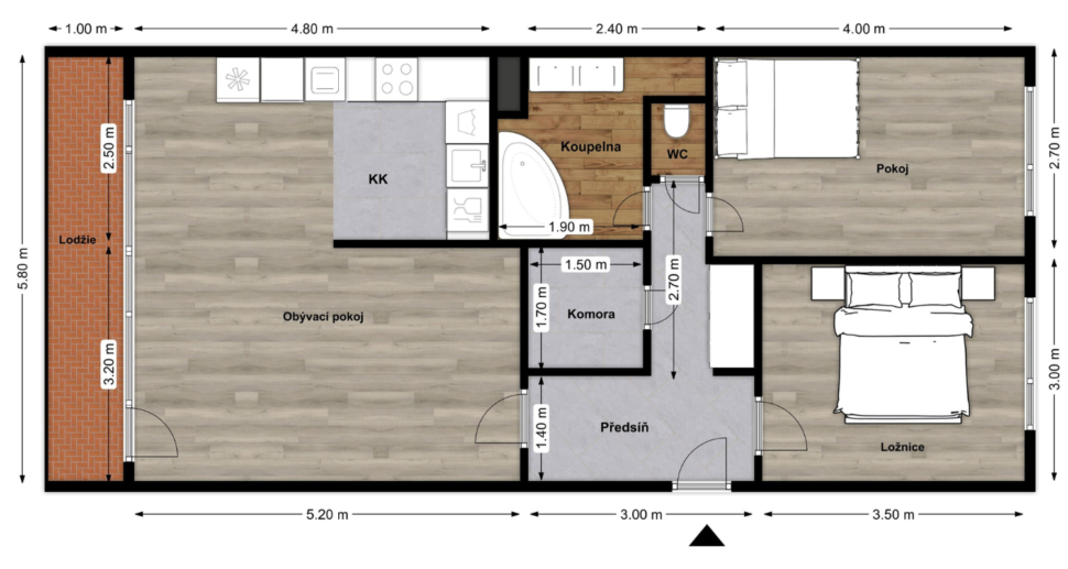 Má užitnou plochu 67 m2 a je rozdělený na obývací pokoj s kuchyňskou linkou, 2 pokoje, koupelnu a samostatnou toaletu. Pro uložení věcí je v bytě praktická komora a vestavěná skříň v předsíni.